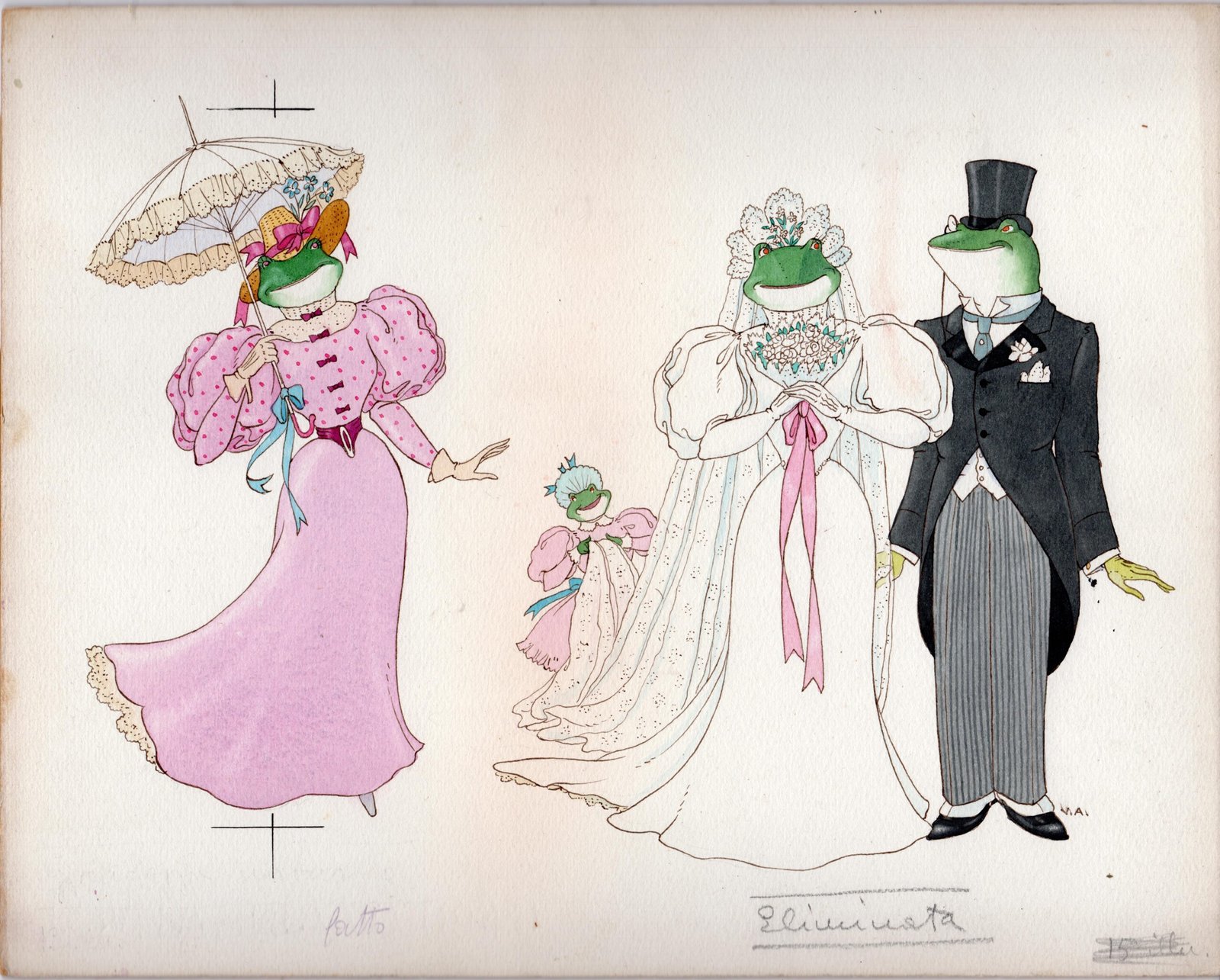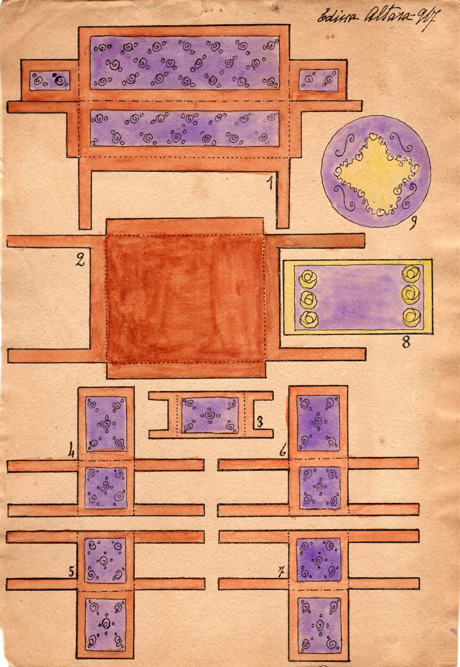 Edina Altara, Il salotto di bebè, 1917, disegno per cartolina da ritagliare, china e acquerello su cartoncino, 25x16,1 cm.