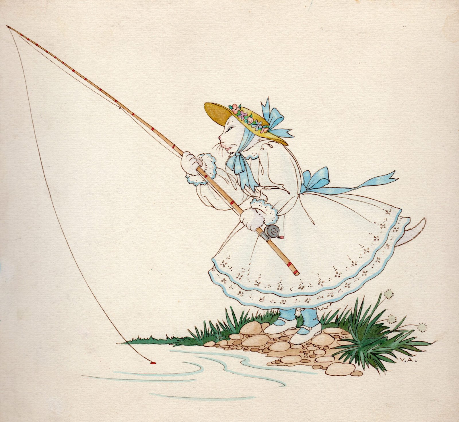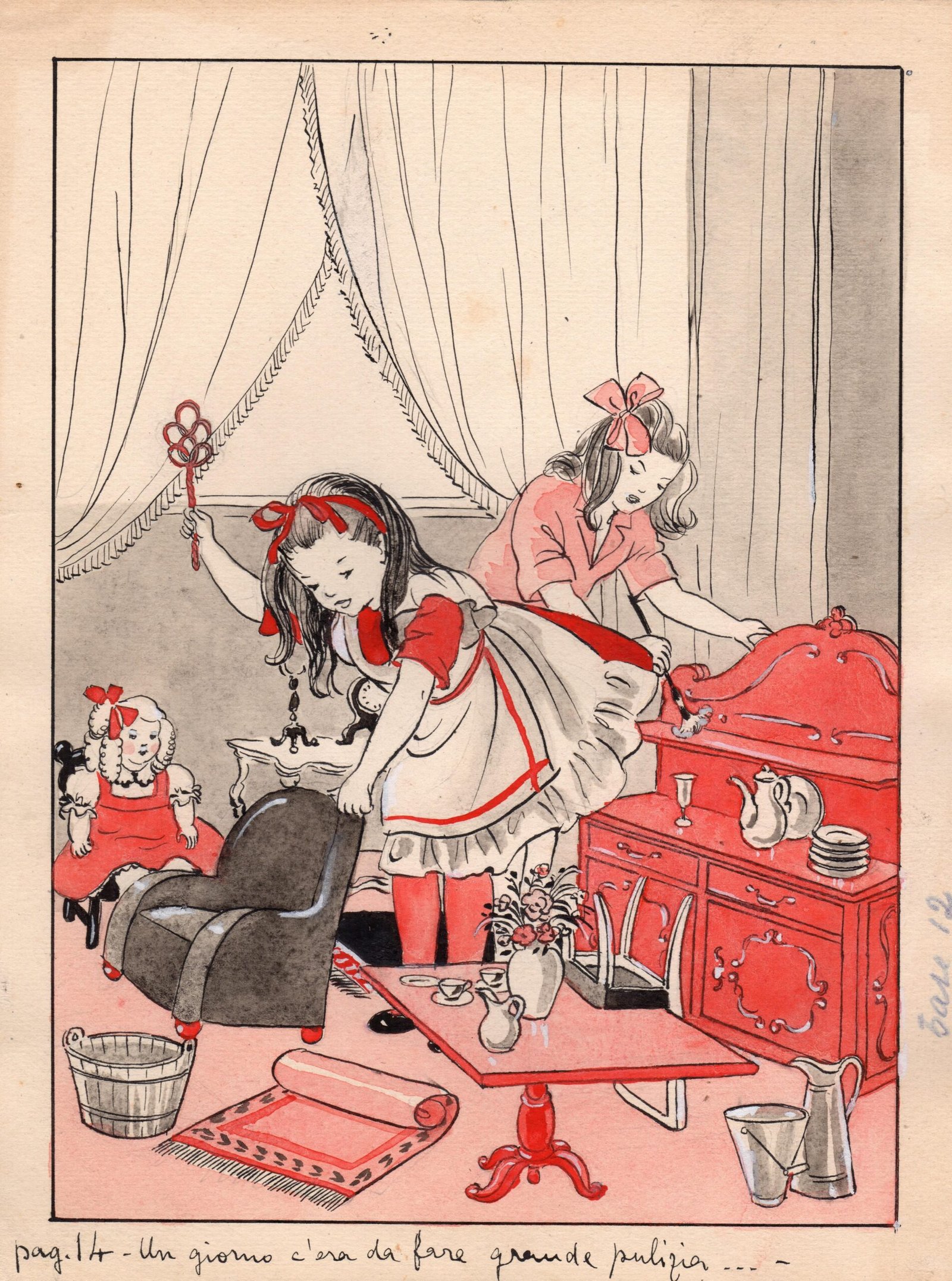 Edina Altara, Disegno per l'edizione Storia di una bambina e di una bambola di Paola Lombroso Carrara edita da Pezzani nel 1948, s.d. [1948], tempera a colori su cartoncino, 24,8 x 18,5 cm.
