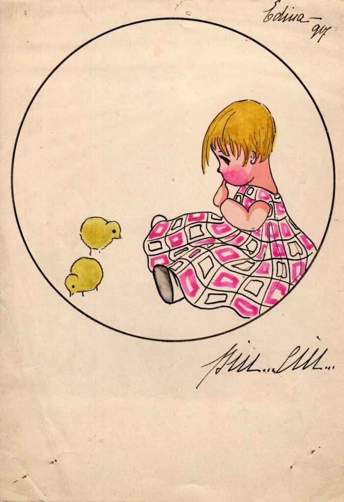 Edina Altara, Disegno originale per cartolina raffigurante una bambina con pulcini e la didascalia “piu…ciu…”, Serie "Bambini e animali", 1917, tempera a colori su cartoncino, 16,3x23,8 cm.