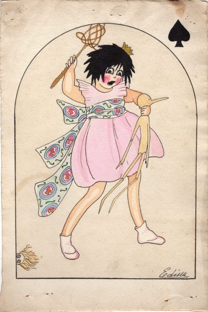 Edina Altara, Disegno originale per cartolina Regina di picche, Serie "Carte da gioco", s.d. [1919], tempera a colori su cartoncino, 14,5x21,7 cm.