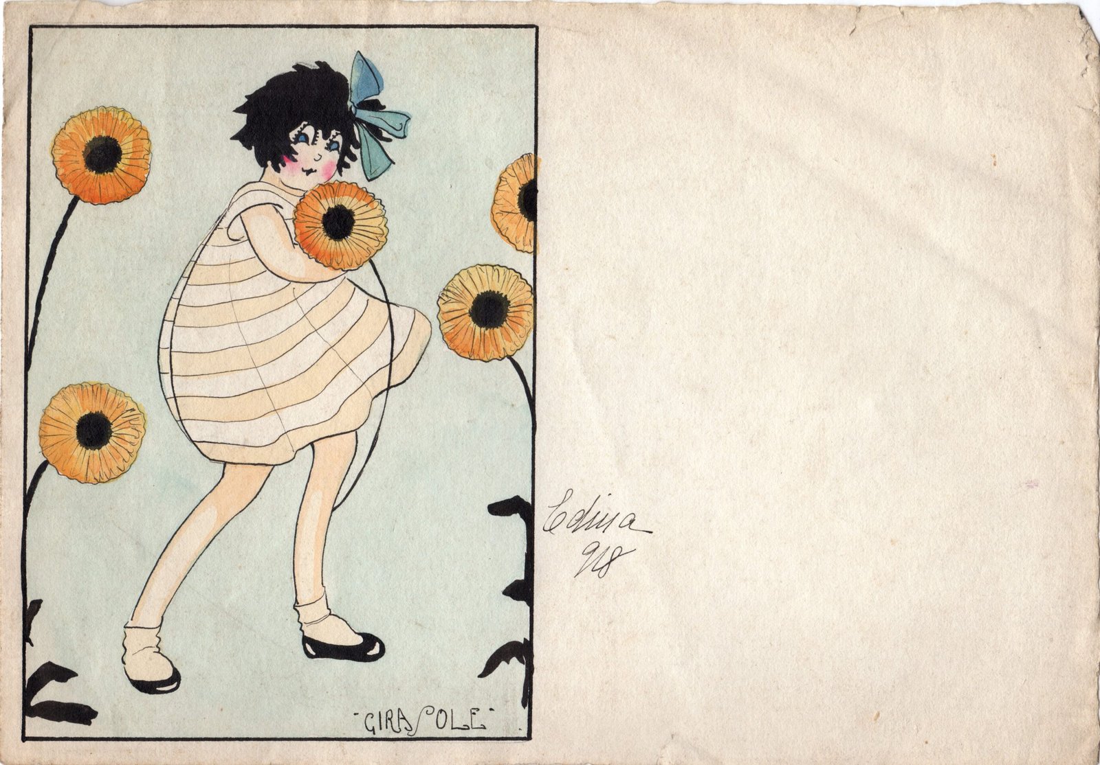 Edina Altara, Disegno originale per cartolina raffigurante una bambini con girasoli, serie "Bambini e fiori", 1918, tempera a colori su cartoncino, 23,8x16,5 cm.