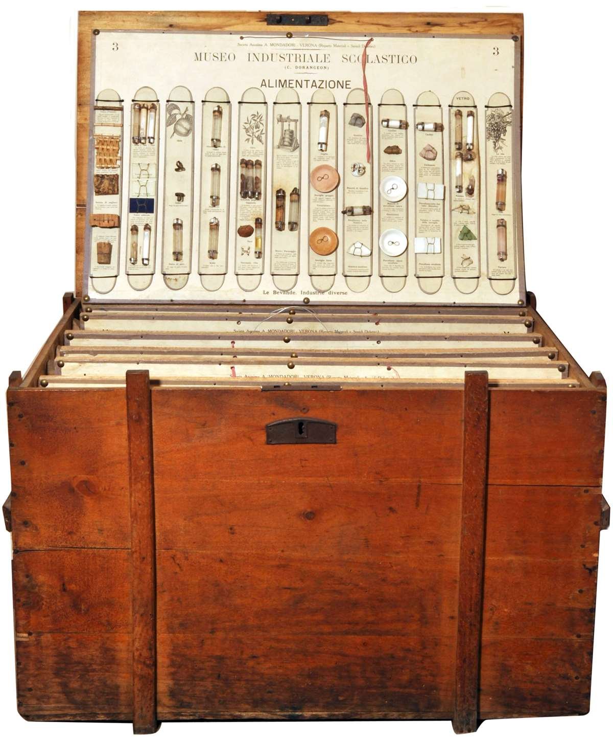 Sussidio didattico ispirato al metodo dell’insegnamento oggettivo e composto da 12 pannelli esplicativi dedicati ai diversi materiali – stoffa, legno, carta, metalli – presenti nella vita quotidiana. Versione italiana dell’originale francese dell’editore Delagrave di Parigi, a cura di Dorangeon. Verona, Mondadori, s.d (1920 circa).