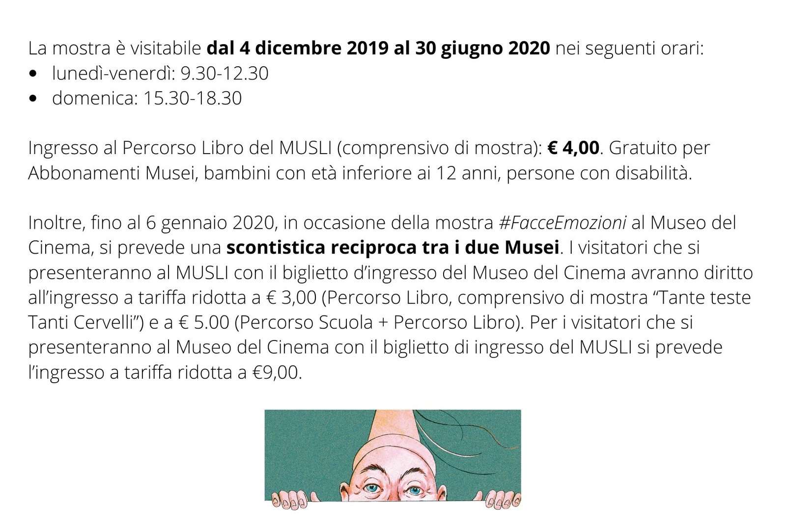 L’esposizione verrà inaugurata martedì 3 dicembre 2019 alle 17.30. Parteciperanno alla presentazione, oltre al curatore Pompeo Vagliani, Donata Pesenti Campagnoni e Simone Arcagni, curatori della mostra #FacceEmozioni, e Maria Cristina Morandini dell’Università di Torino.